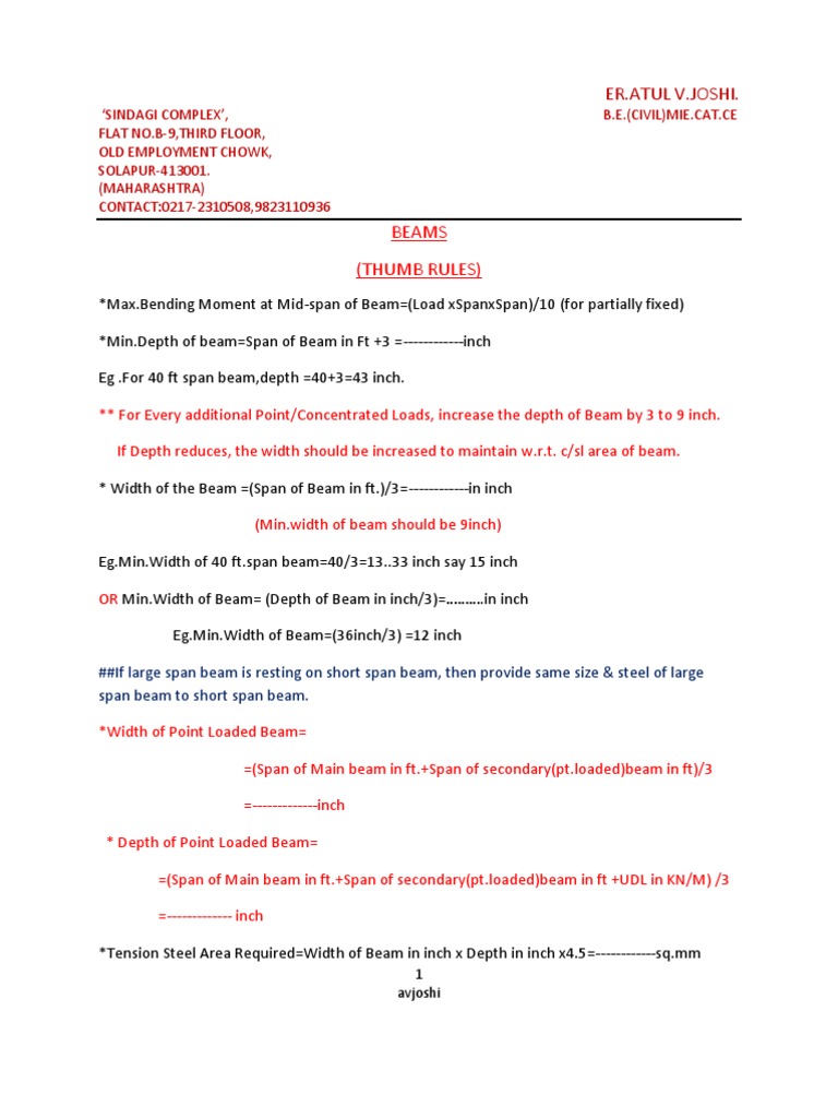 We have found the following rules of thumb to be useful in estimating the approximate depth of a structural member as well as reviewing the reasonableness of a design.